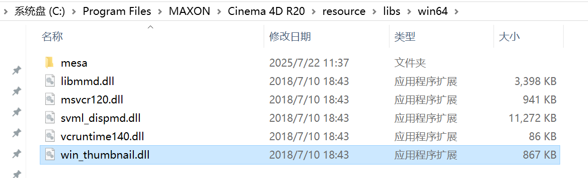 打开 c4d 安装目录,并前往 \resouces\libs\win64 文件夹,找到 win_thumbnail.dll 文件