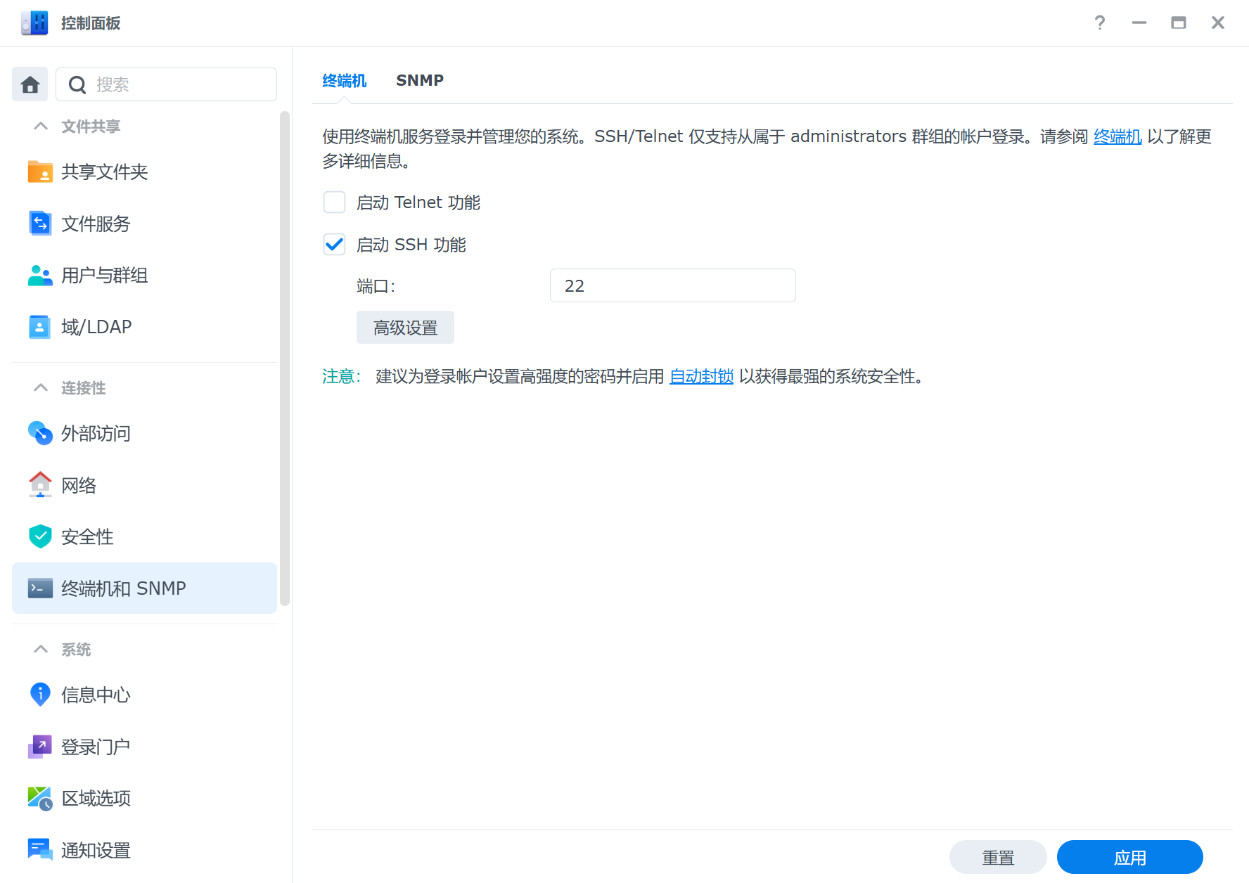 控制面板 -> 终端机和SNMP -> 启动SSH功能,记下端口号,默认22