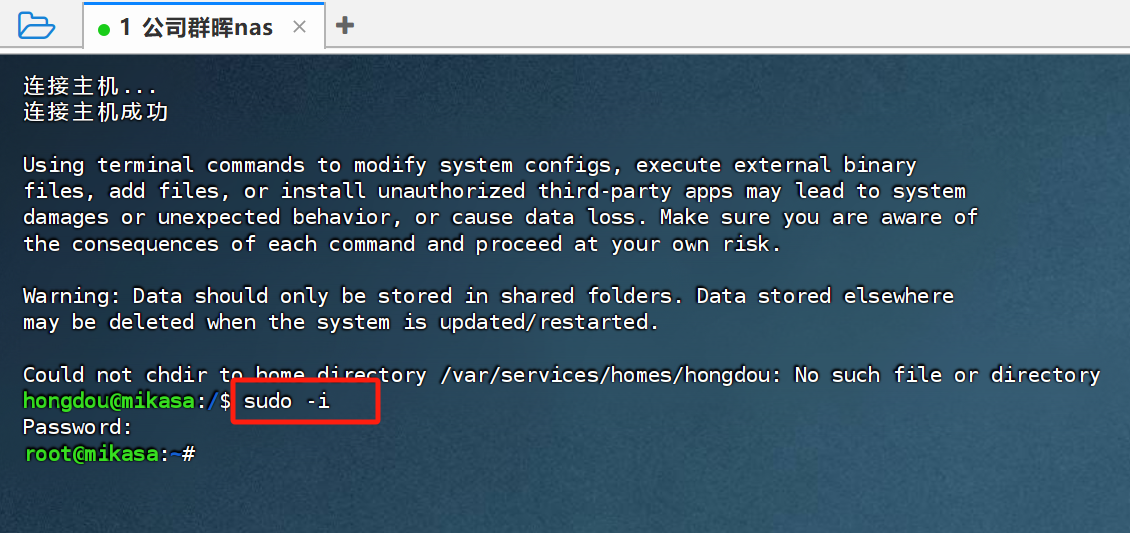 登录以后,输入命令sudo -i 切换成root超管模式,需要输入群晖的密码,输入过程是不可见的,直接回车即可