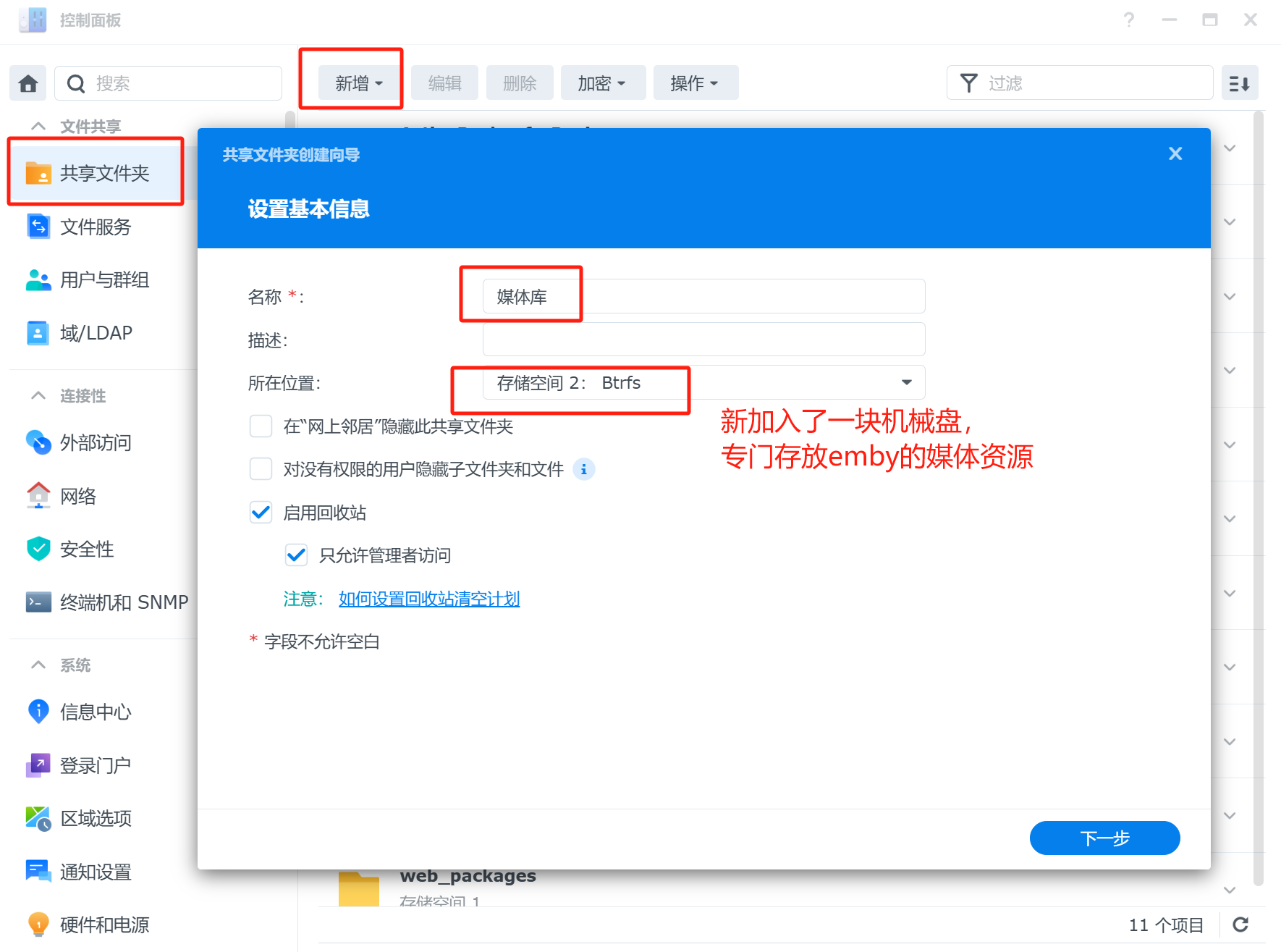 群晖->控制面板->共享文件夹->新增->名称:docker,存储位置一般默认volome1,一直下一步即可