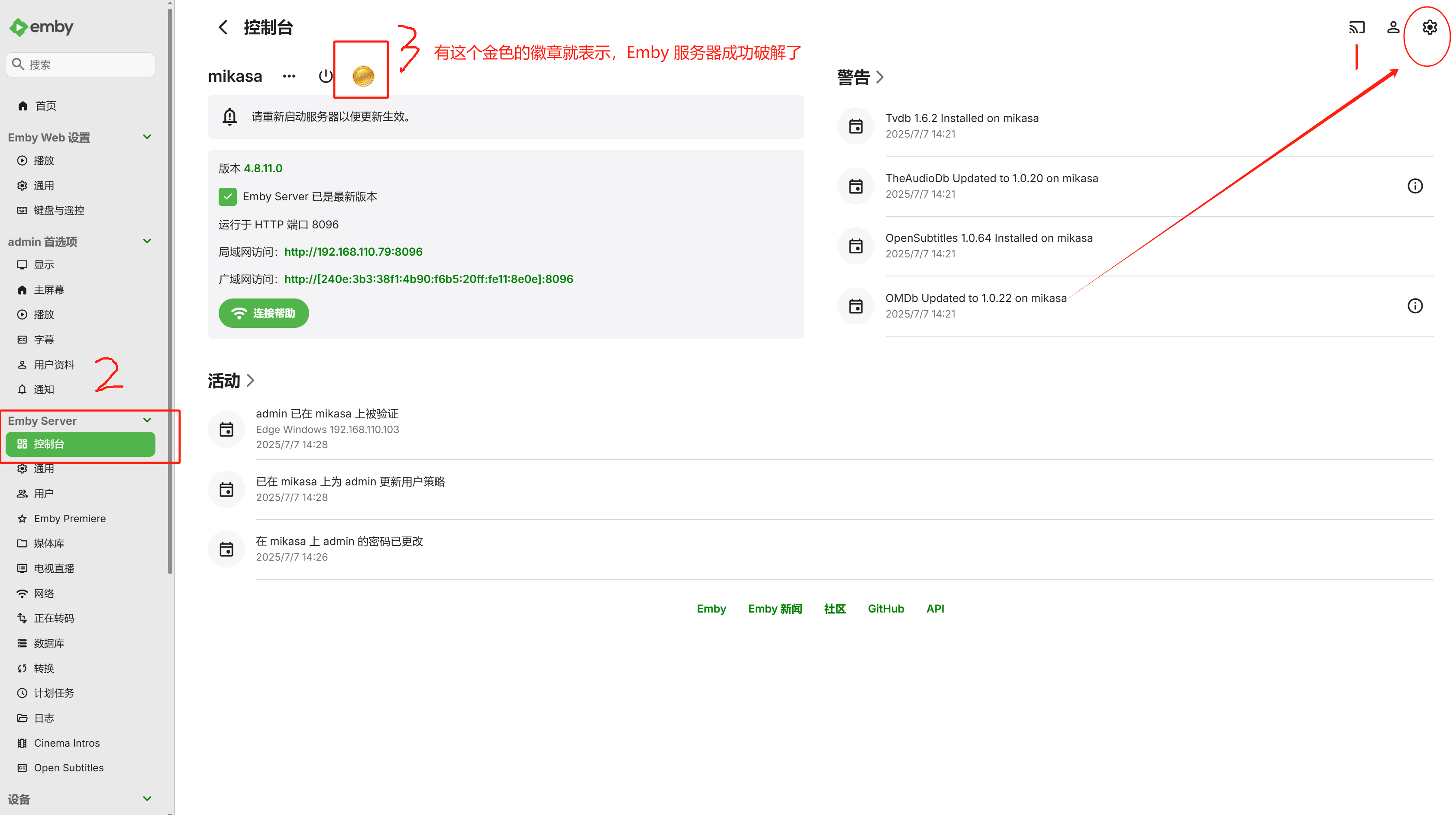 右上角设置 -> 控制台 出现金色的Emby Premiere就代表服务器是成功破解的了