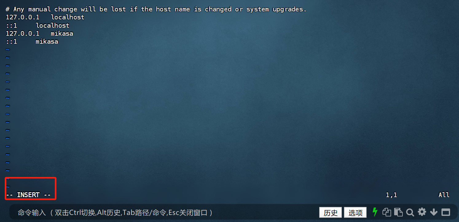 输入命令 vi /etc/hosts 回车,进入文本,再按一下字母i,切换Insert输入模式