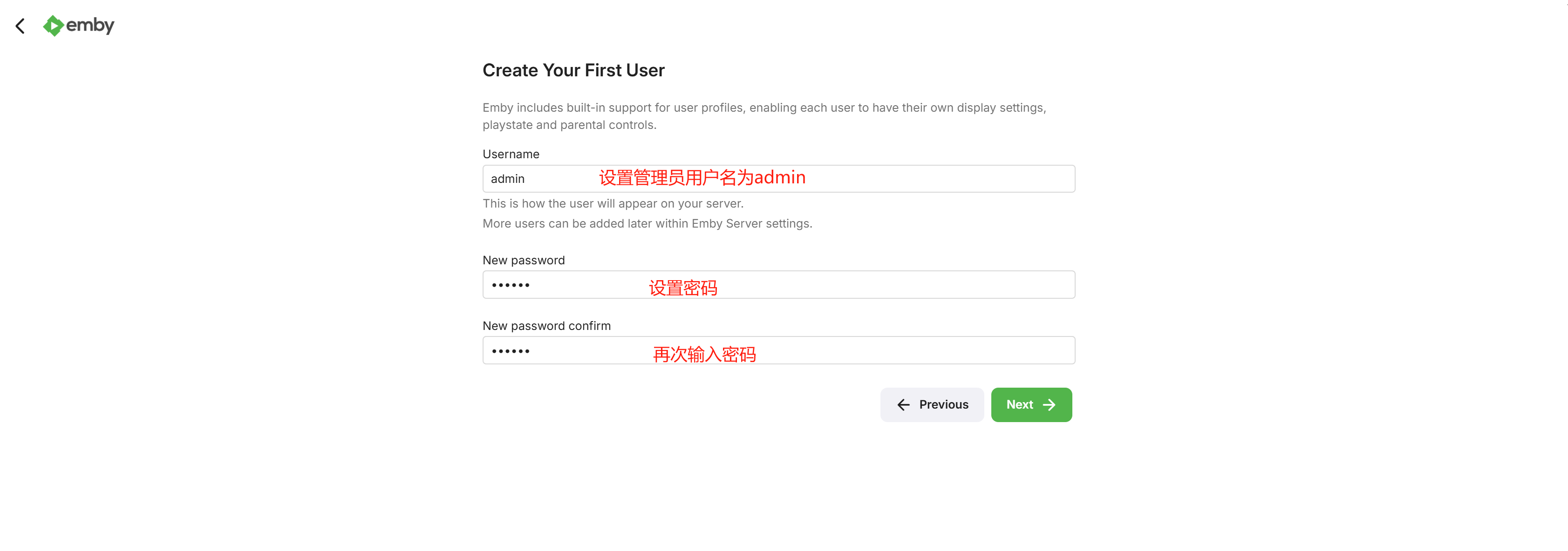 一直下一步接口完成安装,登录刚设置好的admin账户,即可看到emby界面,此时还没有任何内容。