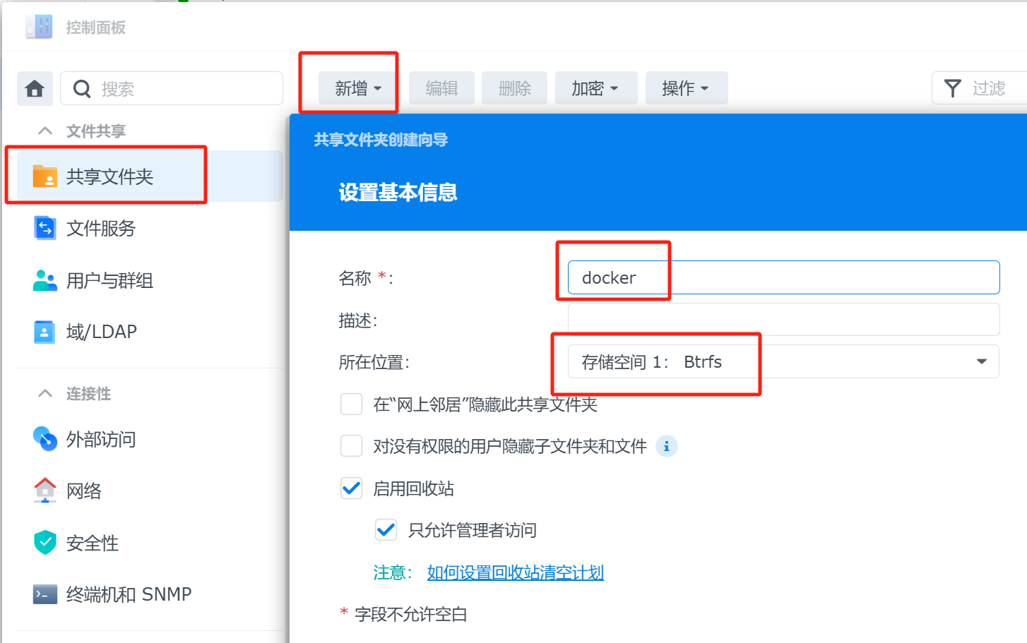 群晖->控制面板->共享文件夹->新增->名称:docker,存储位置一般默认volome1,一直下一步即可