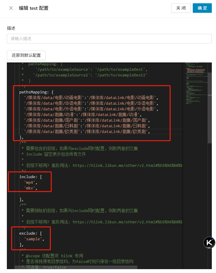 pathsMapping格式:'源文件路径':"目标文件路径'include包含主流的mkv和mp4格式即可exclude排除掉sample样片