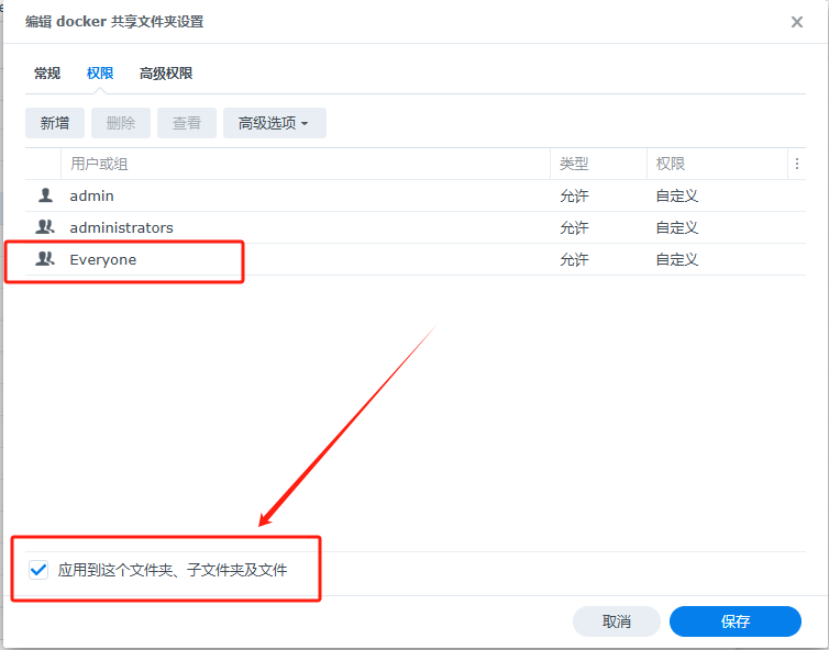 右键docker文件夹-属性-权限-新增everyone权限,勾选读取和写入