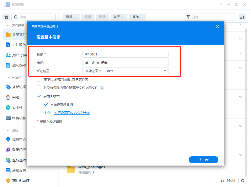 我群晖新增了一块18T机械盘,用于存储影视剧资源,我创建一级共享文件夹为PT1801,将整个一级大文件夹映射给mp关联