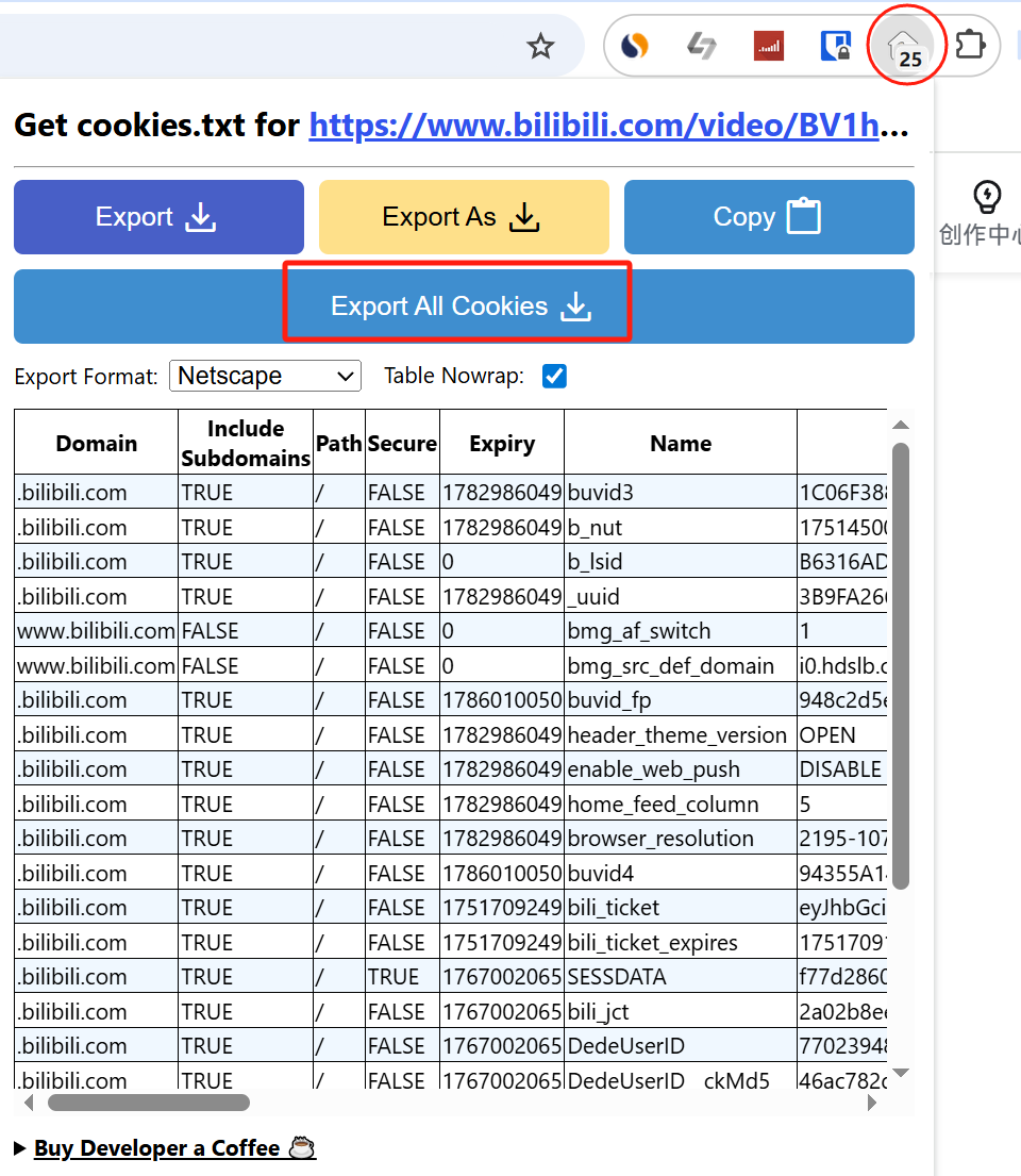 https://microsoftedge.microsoft.com/addons/detail/cookieeditor/neaplmfkghagebokkhpjpoebhdledlfi?hl=zh-CN用谷歌浏览器安装好插件后,登录B站,随便播放一个视频,然后按图示方法导出cookies.txt